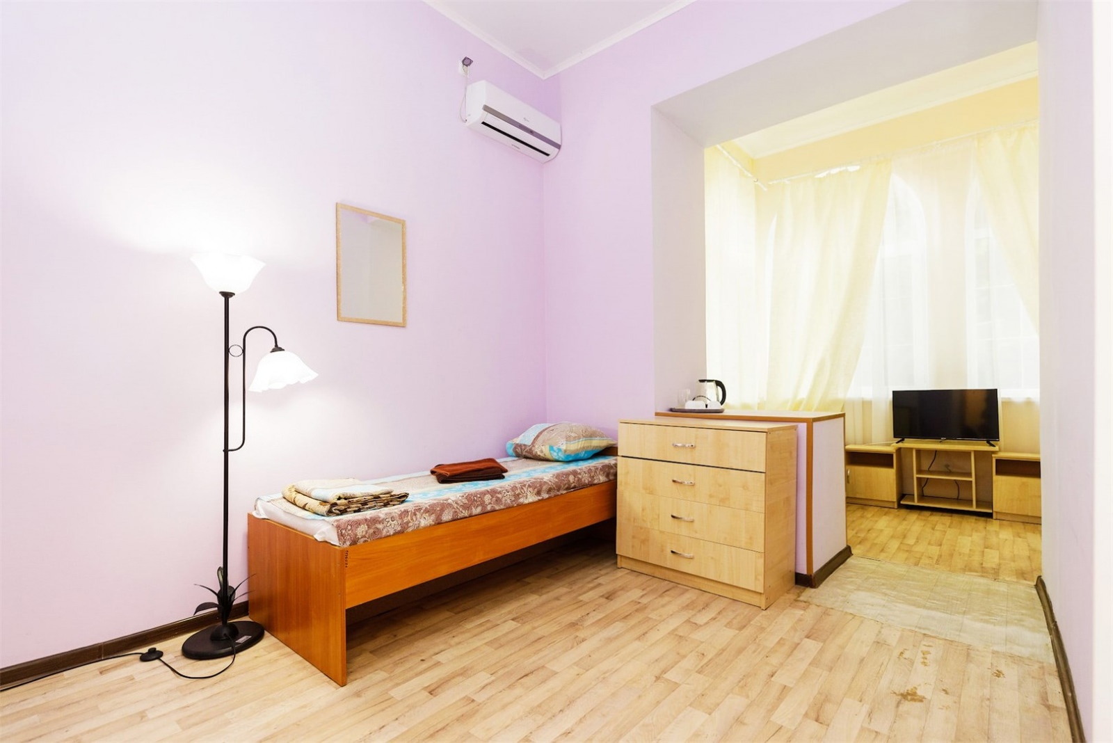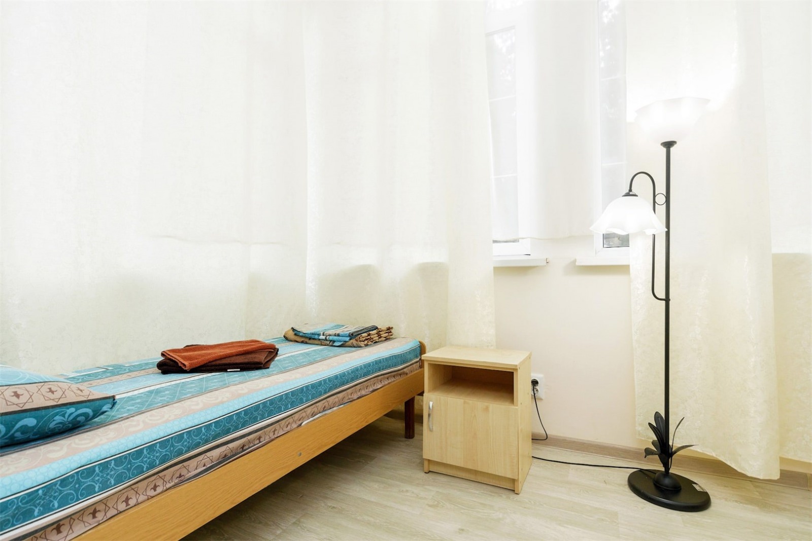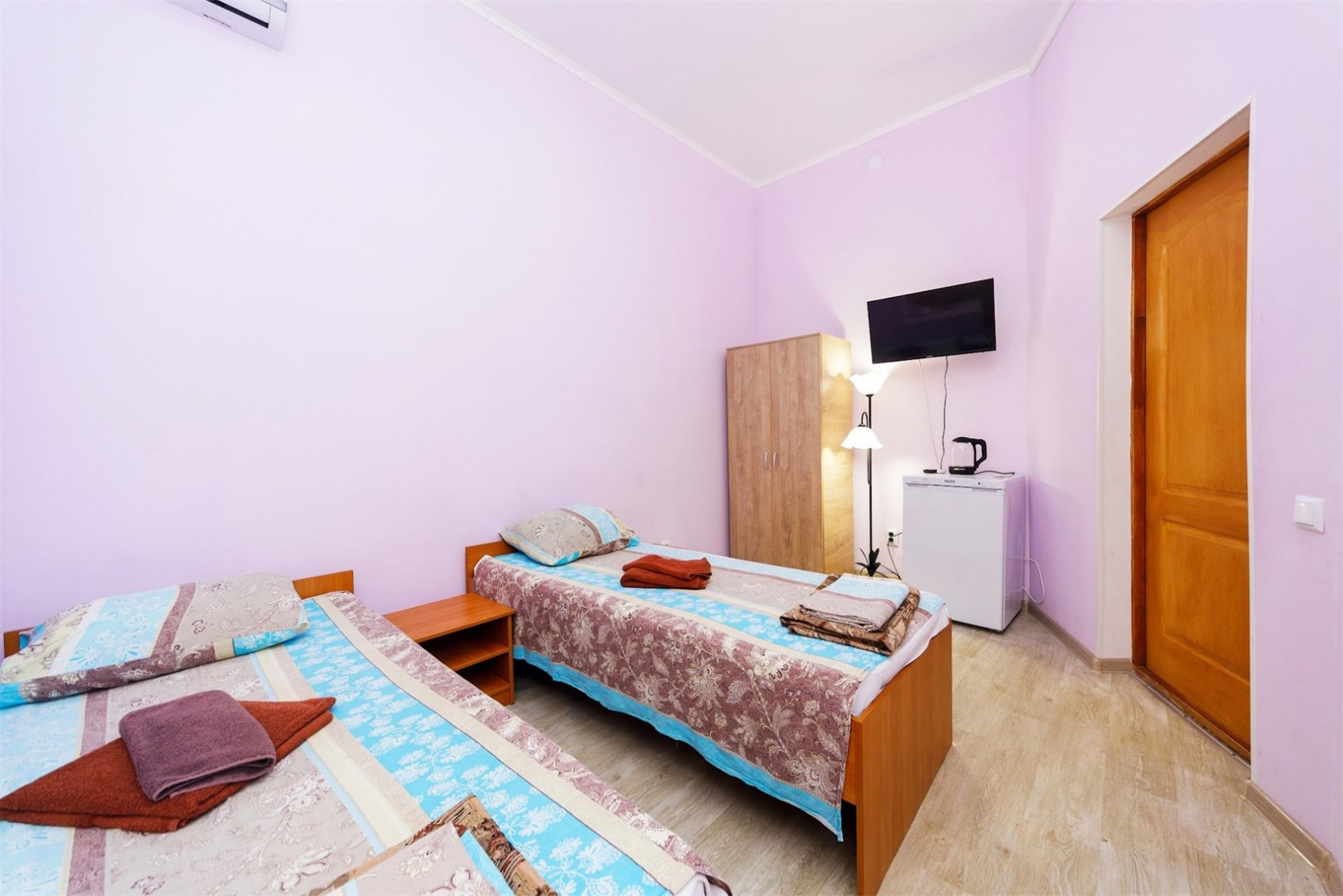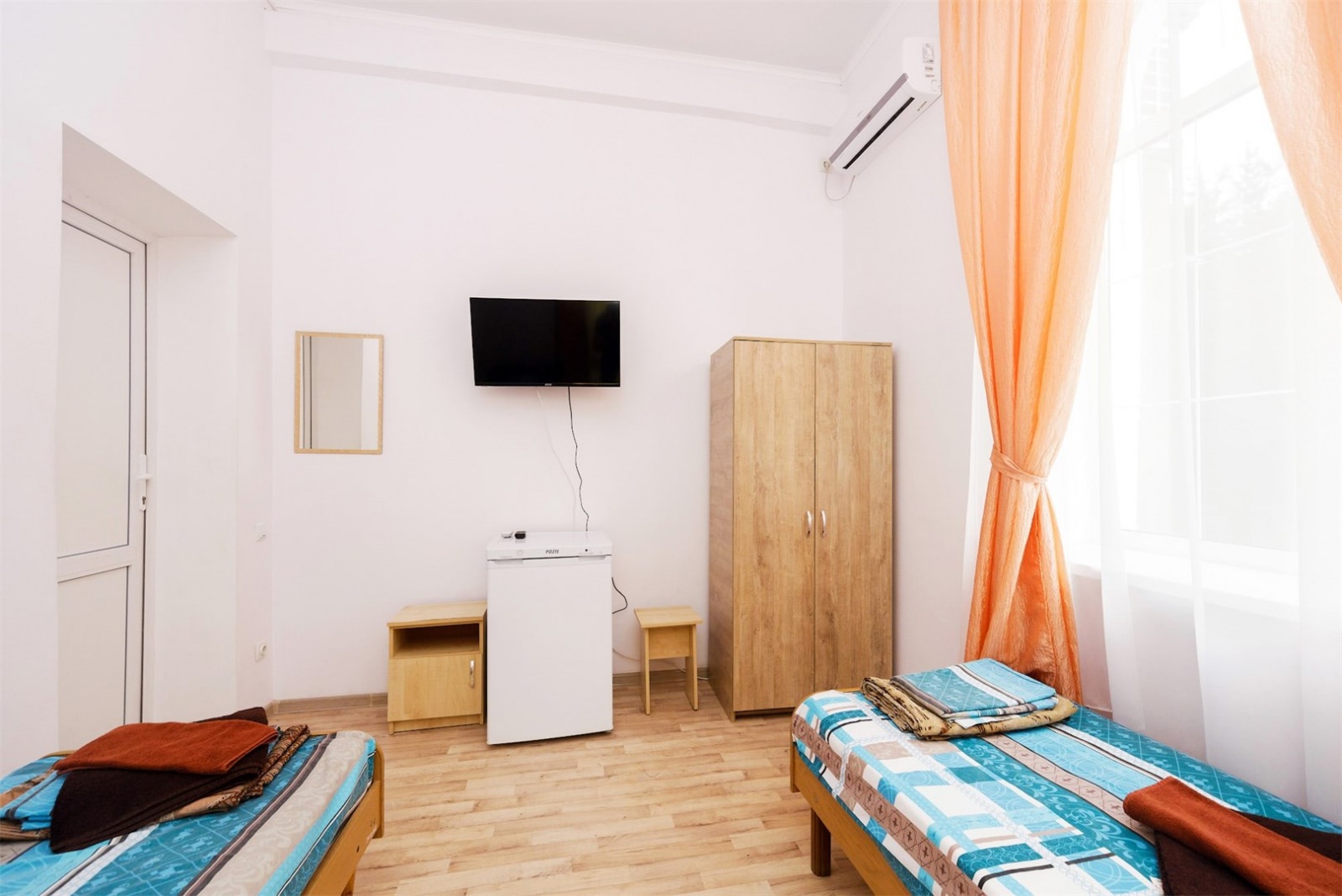 Номер трехместный однокомнатный или двухкомнатный без удобств в корпусе номер 8 (замок). Удобства на блок(на 2 номера) в коридоре между номерами(душ,туалет,умывальник). Так же в холле корпуса-замка есть гладильная комната и кулер с водой. В номере есть вся необходимая гостиничная мебель,телевизор с плоским экраном и кондиционер. На всей территории корпуса работает бесплатный WI-FI. Обслуживание номеров: уборка номеров, смена постельного белья, смена полотенец - раз в 3 дня или по запросу.Санаторий владеет своим пляжным участком, предназначенным только для отдыхающих здравницы. Расстояние от корпуса-замок до береговой линии составляет 550 метров.