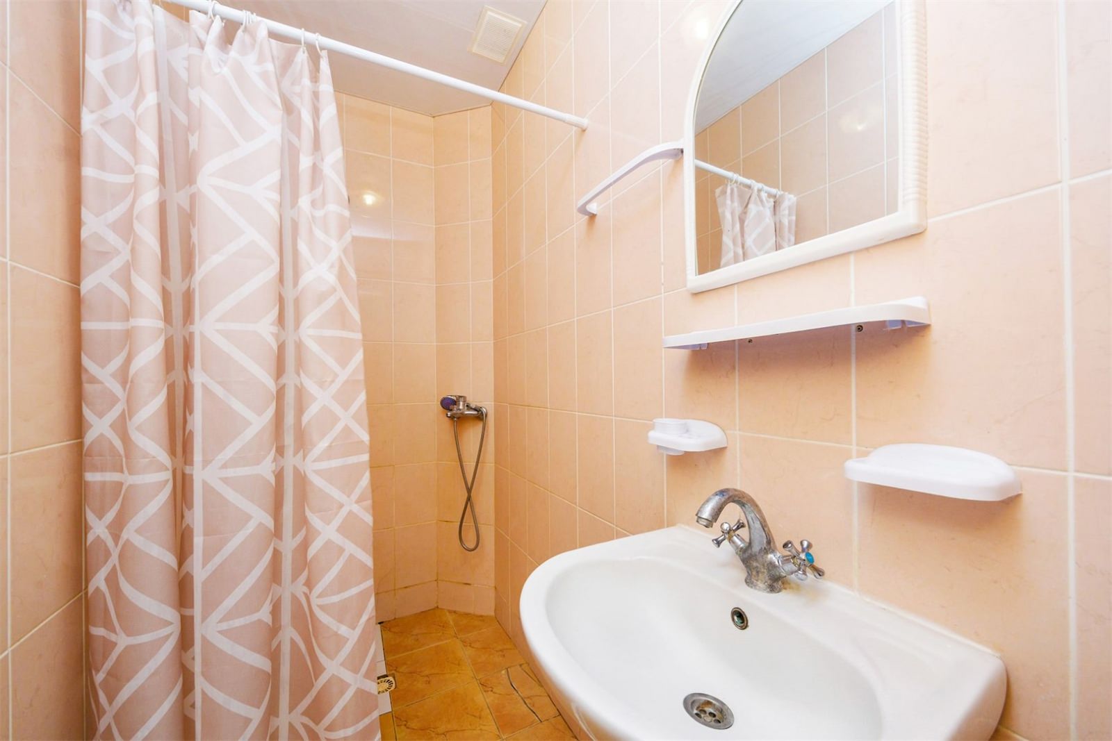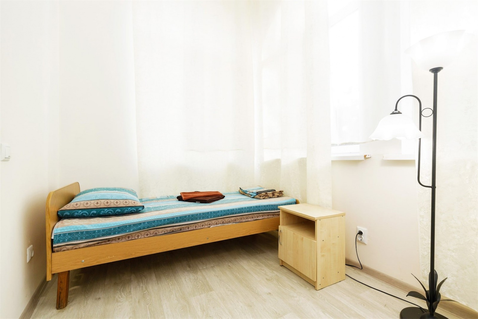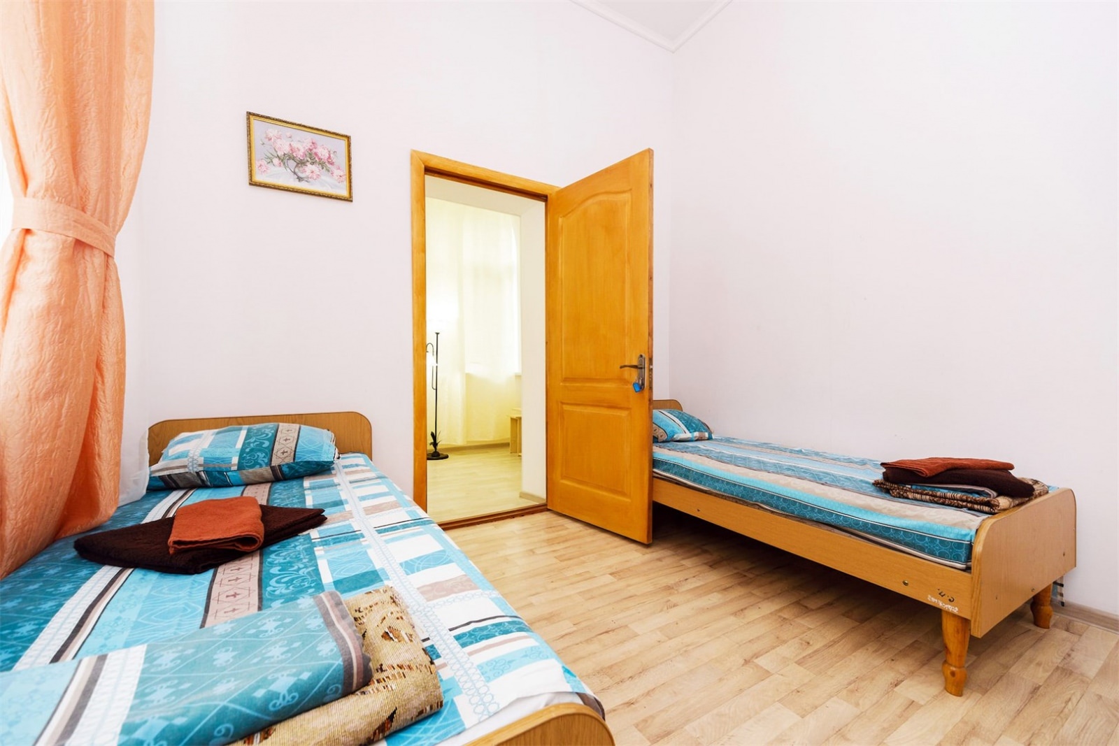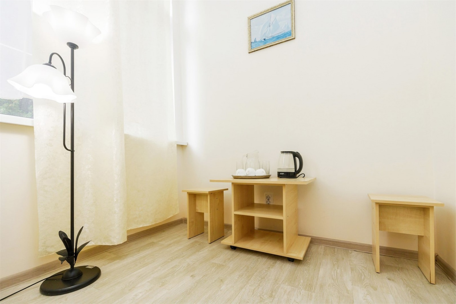 Номер трехместный однокомнатный или двухкомнатный без удобств в корпусе номер 8 (замок). Удобства на блок(на 2 номера) в коридоре между номерами(душ,туалет,умывальник). Так же в холле корпуса-замка есть гладильная комната и кулер с водой. В номере есть вся необходимая гостиничная мебель,телевизор с плоским экраном и кондиционер. На всей территории корпуса работает бесплатный WI-FI. Обслуживание номеров: уборка номеров, смена постельного белья, смена полотенец - раз в 3 дня или по запросу.Санаторий владеет своим пляжным участком, предназначенным только для отдыхающих здравницы. Расстояние от корпуса-замок до береговой линии составляет 550 метров.