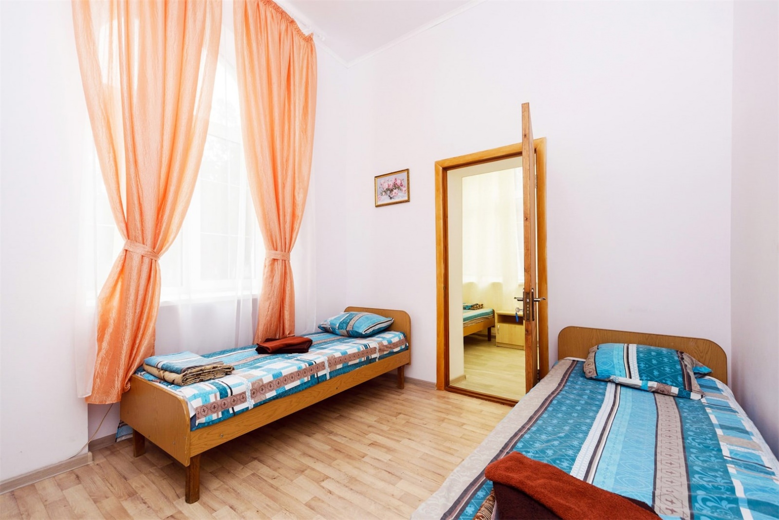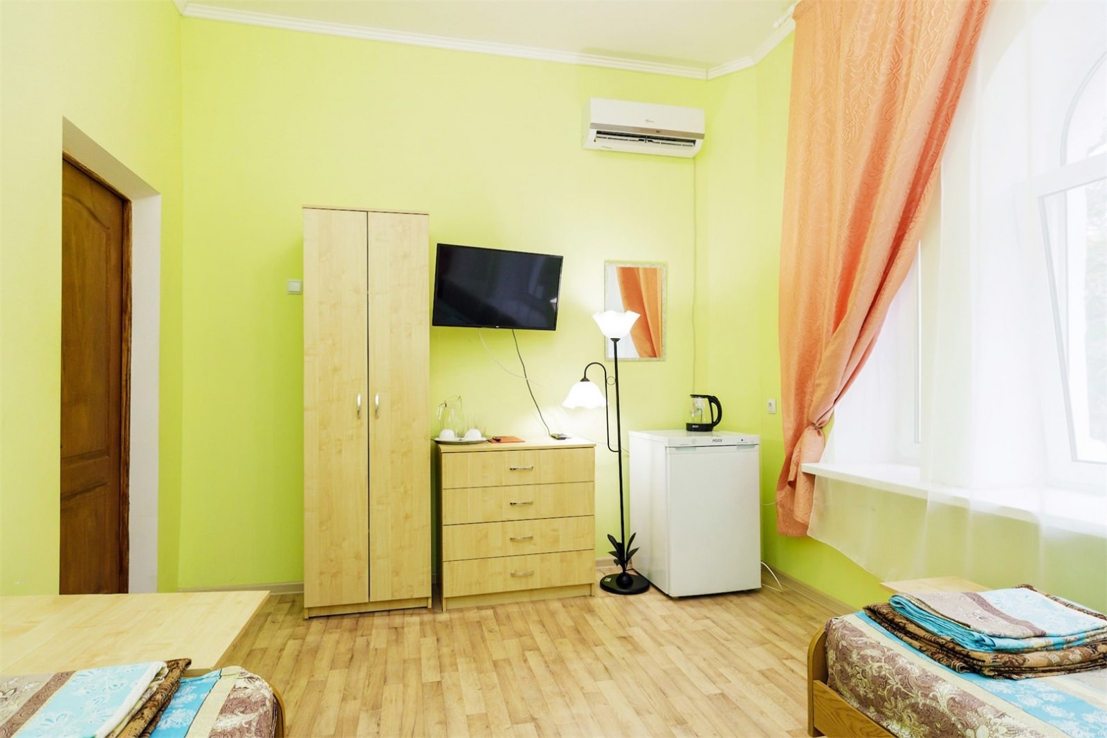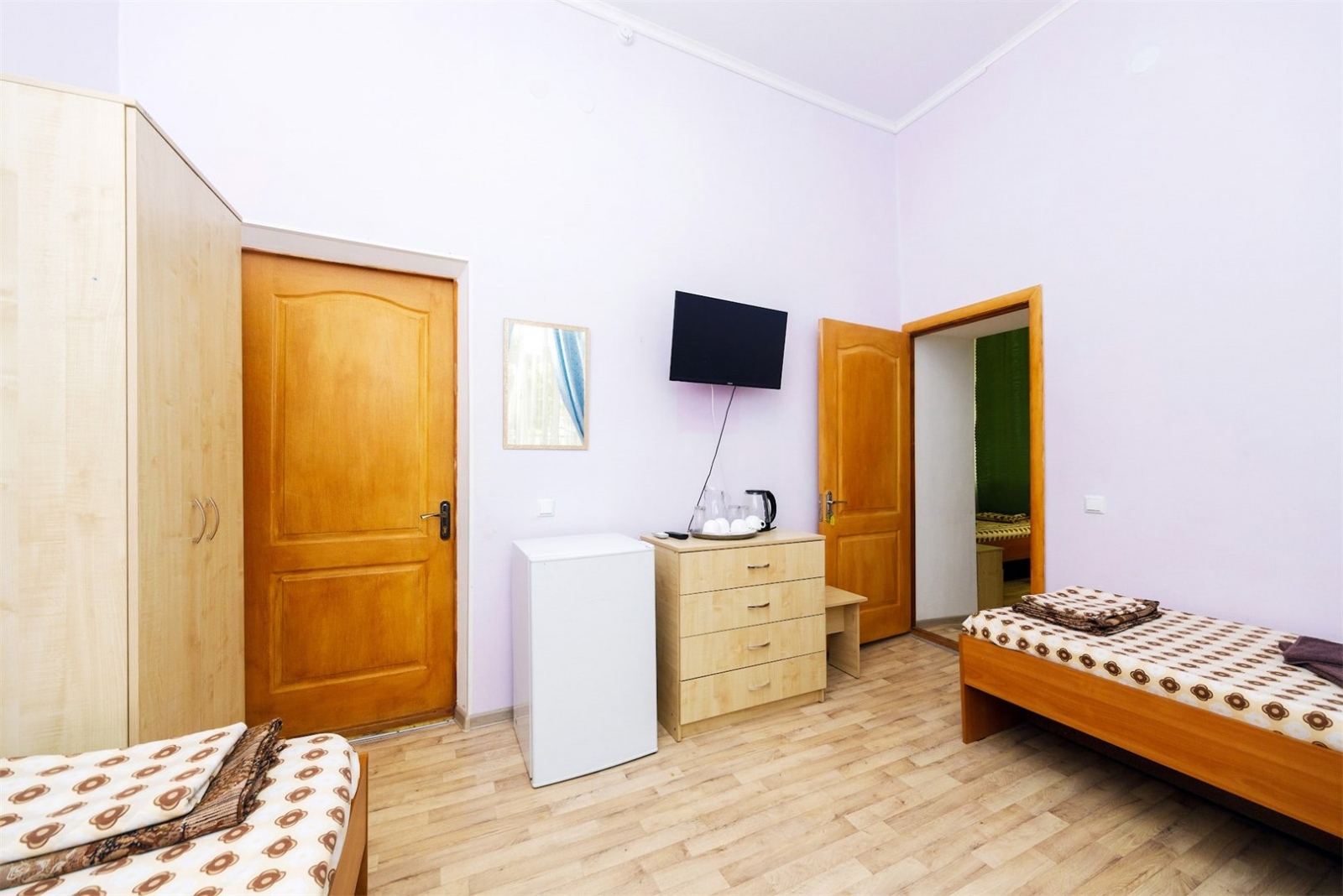Номер четырех местный однокомнатный или двухкомнатный без удобств в корпусе номер 8 (замок). Удобства на блок(на 2 номера) в коридоре между номерами(душ,туалет,умывальник). Так же в холле корпуса-замка есть гладильная комната и кулер с водой. В номере есть вся необходимая гостиничная мебель,телевизор с плоским экраном и кондиционер. На всей территории корпуса работает бесплатный WI-FI. Обслуживание номеров: уборка номеров, смена постельного белья, смена полотенец - раз в 3 дня или по запросу.Санаторий владеет своим пляжным участком, предназначенным только для отдыхающих здравницы. Расстояние от корпуса-замок до береговой линии составляет 550 метров.